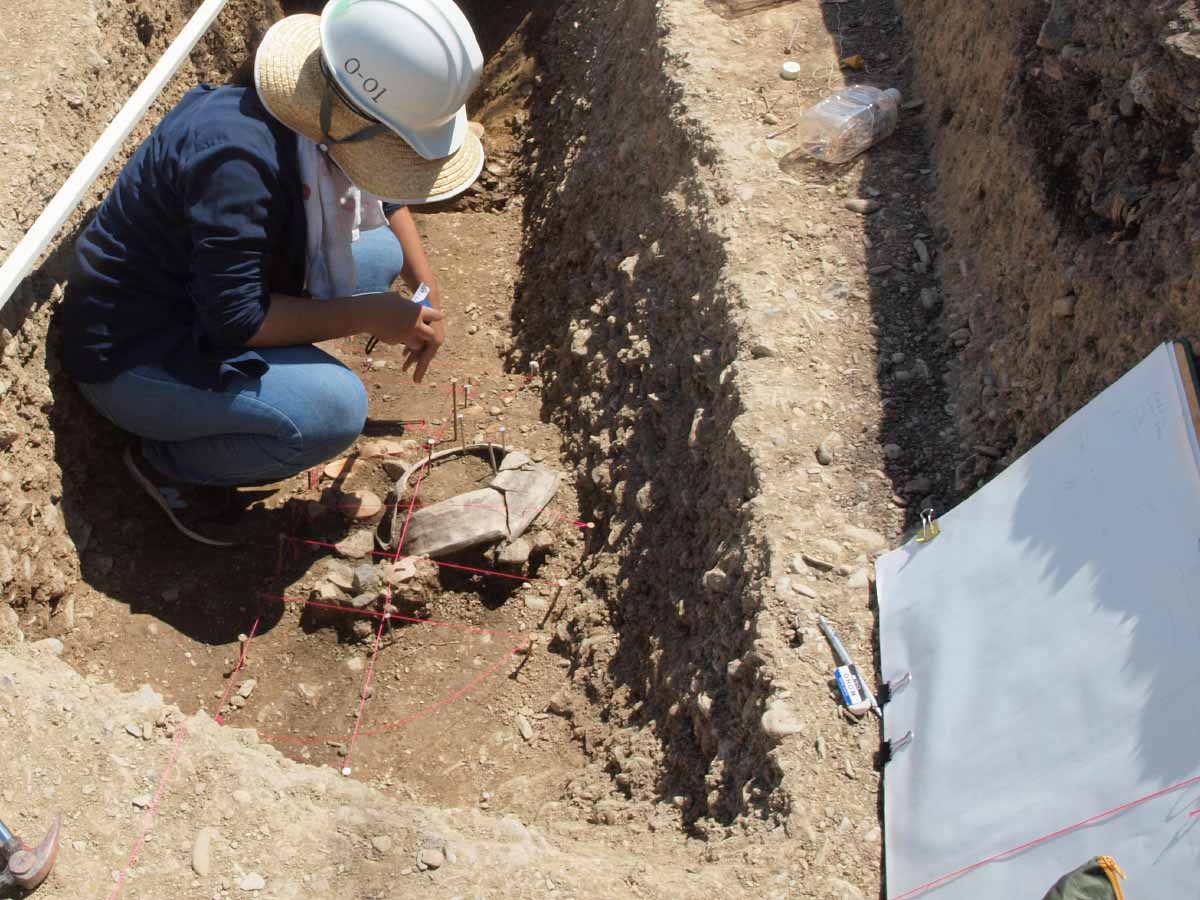埋蔵文化財を包蔵する土地を掘削して、遺構や遺物を検出する作業です。
