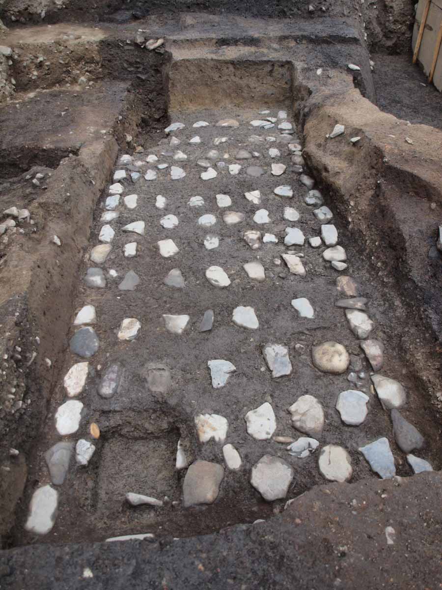 しかし当地は扇状地の高みの縁辺にあたり、今回の調査では平安時代後期の整地層は一部で確認できたものの、鎌倉~室町時代の中世には採土をおこなった土取り穴やその穴を利用した塵芥などの廃棄処理の痕跡がうかがえ、ゴミの集積所に近い土地利用が中心となっていたようです。ただ、鎌倉末~室町初め(14世紀頃)と考えられる「室(むろ)」の遺構が1基確認できました。「室」とは食物等の貯蔵に利用した地下施設のことをいいます。今回検出した室は床に石を敷いた長方形のもので、おそらく15世紀初め頃までに廃絶しており、廃絶後に大量の炭や焼土を含む土で埋められていました。この室が廃絶して以降当地は、室町末~安土桃山時代頃にようやく宅地面の整備がなされたようです。